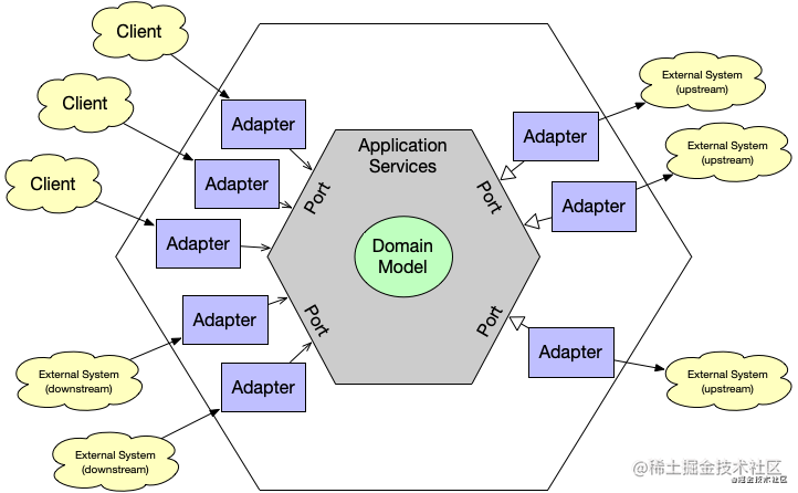 领域逻辑是在业务核心中指定的,我们将其称为内部部分,其余部分为外部部分。 通过端口和适配器可以从外部访问领域逻辑。