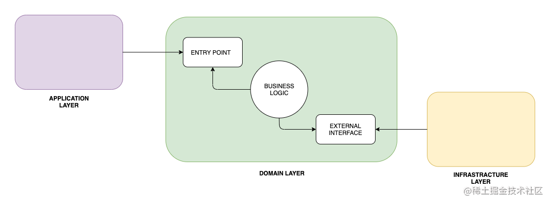 相反,我们要做的是将应用程序分为三层: **应用程序(外部),域(内部)和基础结构(外部)**:
